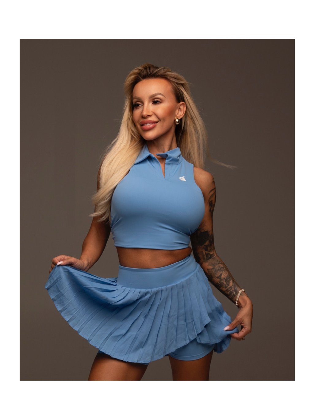 Questo completo sportivo è ideale per donne attive che cercano una combinazione di funzionalità e stile. Il top senza maniche con colletto e supporto interno offre un look elegante, comfort e il giusto sostegno per il seno durante le attività sportive. Gli shorts con gonna plissettata offrono praticità e stile, con una tasca per piccoli oggetti e una vita media per un maggiore comfort.