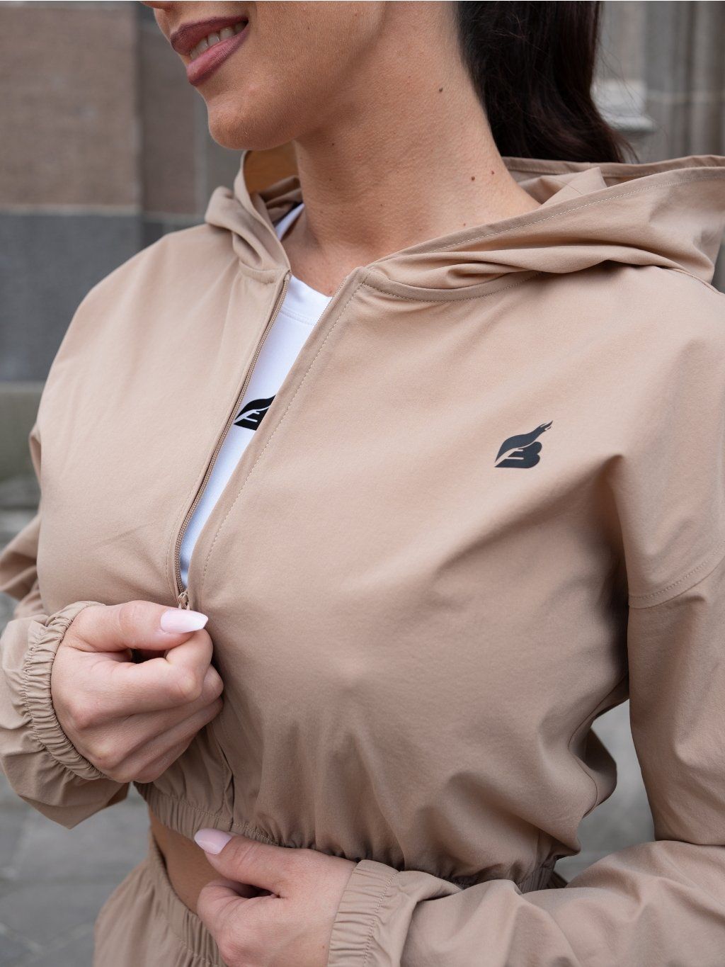 Bunda má kratší crop strih, kapucňu, zapínanie na zips a praktické vrecká. Spodná časť je zakončená elastickou gumou, vďaka ktorej pekne drží tvar a zvýrazňuje siluetu.